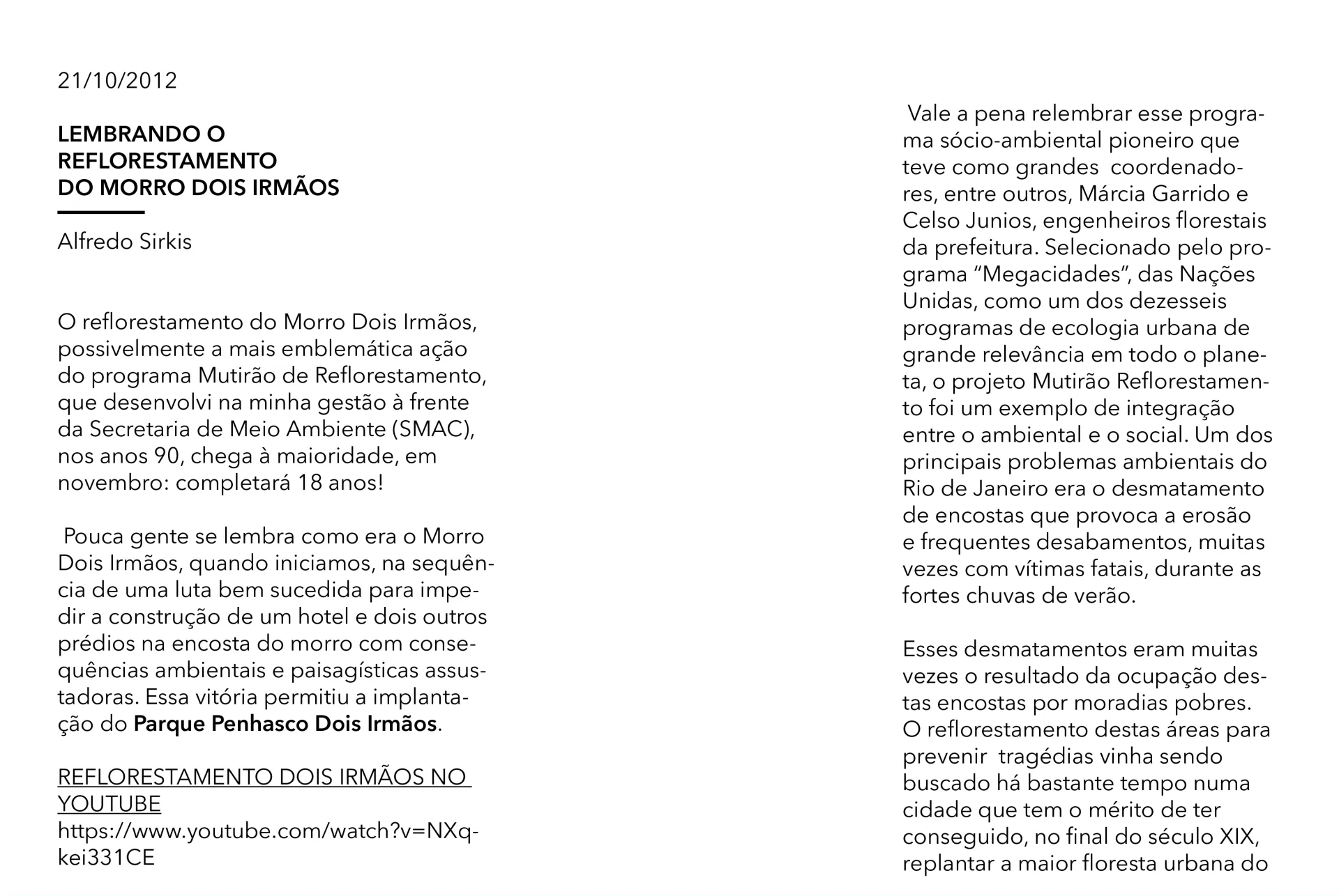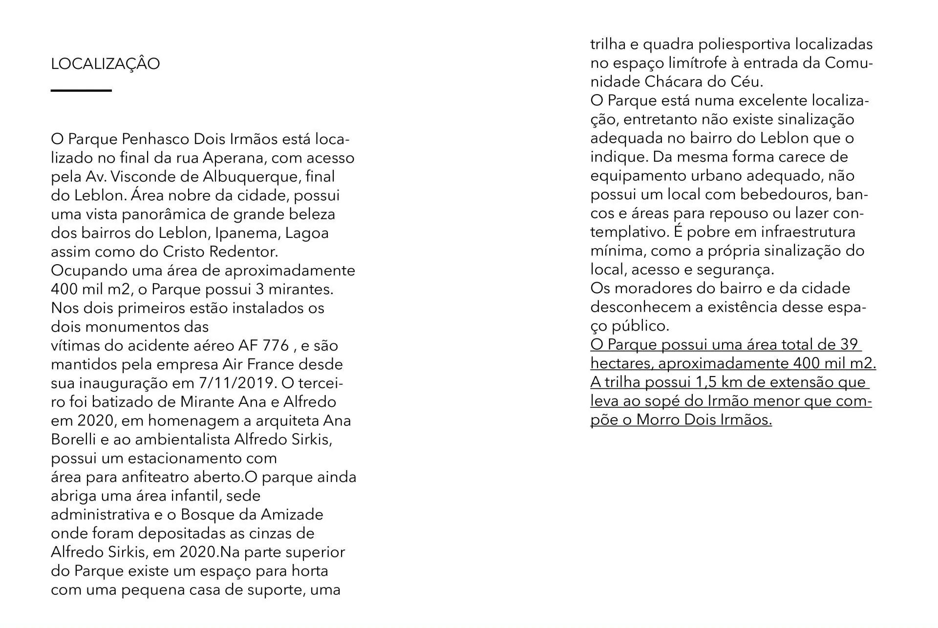 História, projeto de recuperação e novo uso do Parque Penhasco Dois Irmãos.